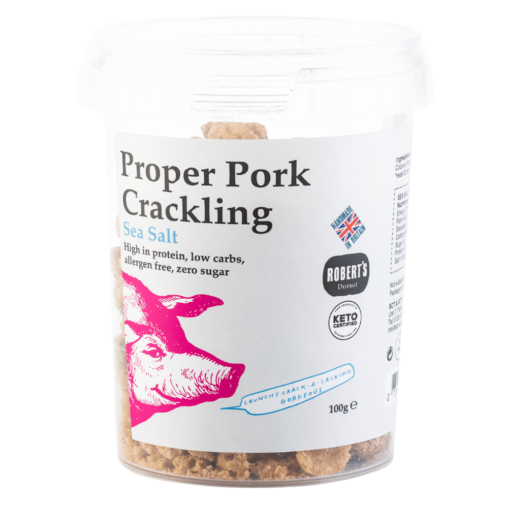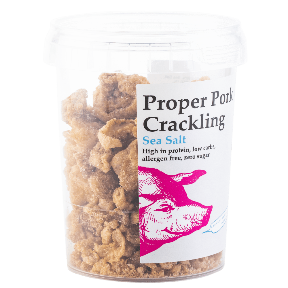 Description Our triple-cooked crackling has an unbeatable crunch with our consistency of quality. NO MSG, NO Artificial flavours, NO Enhancers, NO Compromise. Crack-A-Lacking Gorgeous, Proper Pork Crackling. Nutrition Sea Salt Flavour Proper Pork Crackling Nutritional Facts per 100g: Energy 2710KJ, Calories 654Kcal, Fats 54.3g, Saturated 19.37, Carbohydrates 0.7g, Sugar 0.2g,...