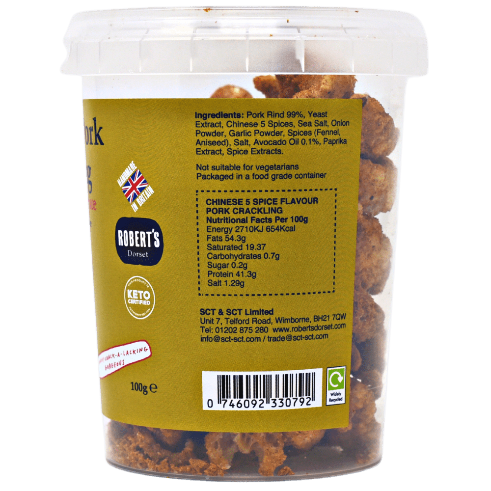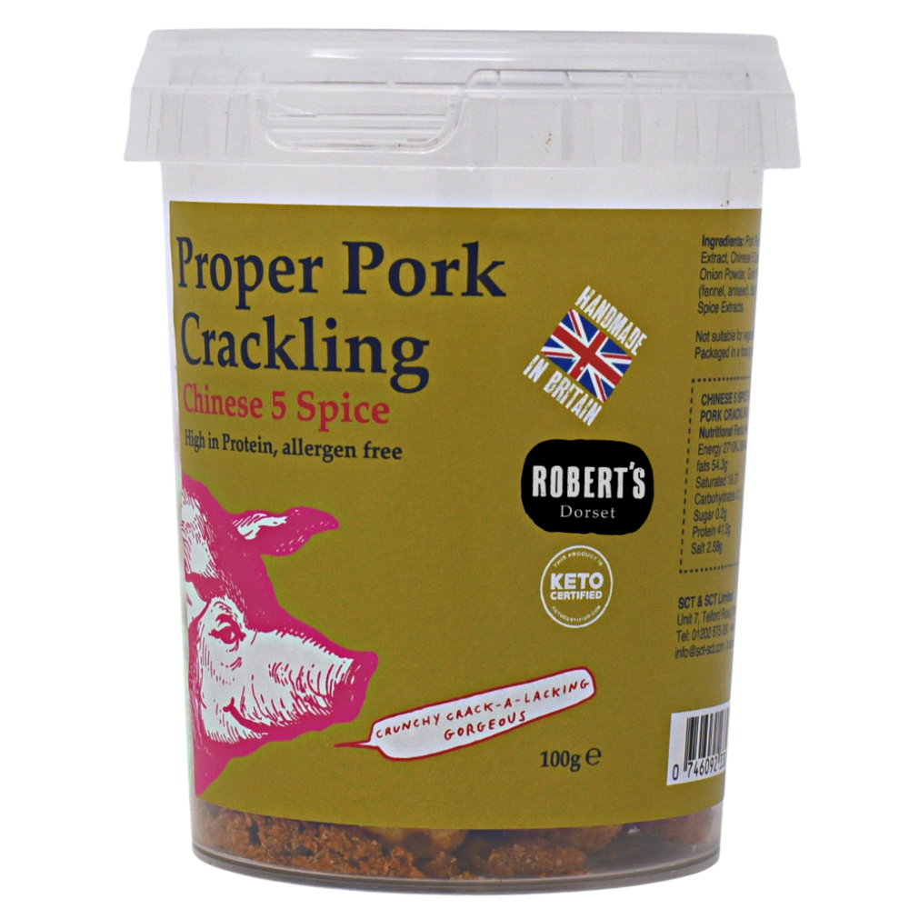 Description Our triple-cooked crackling has an unbeatable crunch with our consistency of quality. NO MSG, NO Artificial flavours, NO Enhancers, NO Compromise. Crack-A-Lacking Gorgeous, Proper Pork Crackling. Nutrition Nutritional Facts per 100g: Energy 2710KJ 654Kcal, Fats 54.3, Saturated 19.37, Carbohydrates 0.7g, Sugar 0.2g, Protein 41.3g, Salt 2.58g. Not suitable for vegetarians. Ingredients...