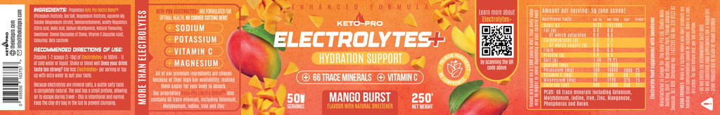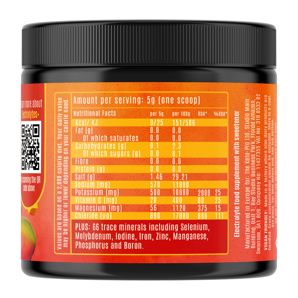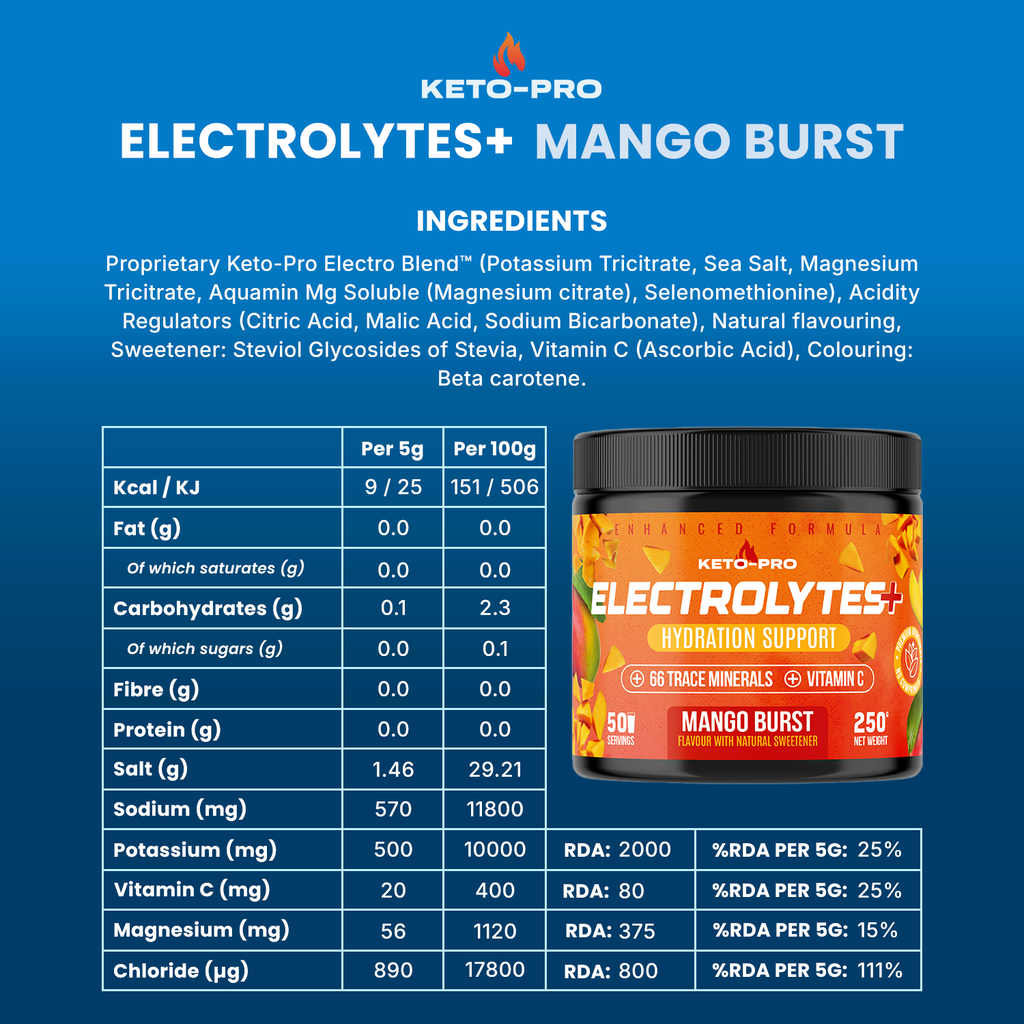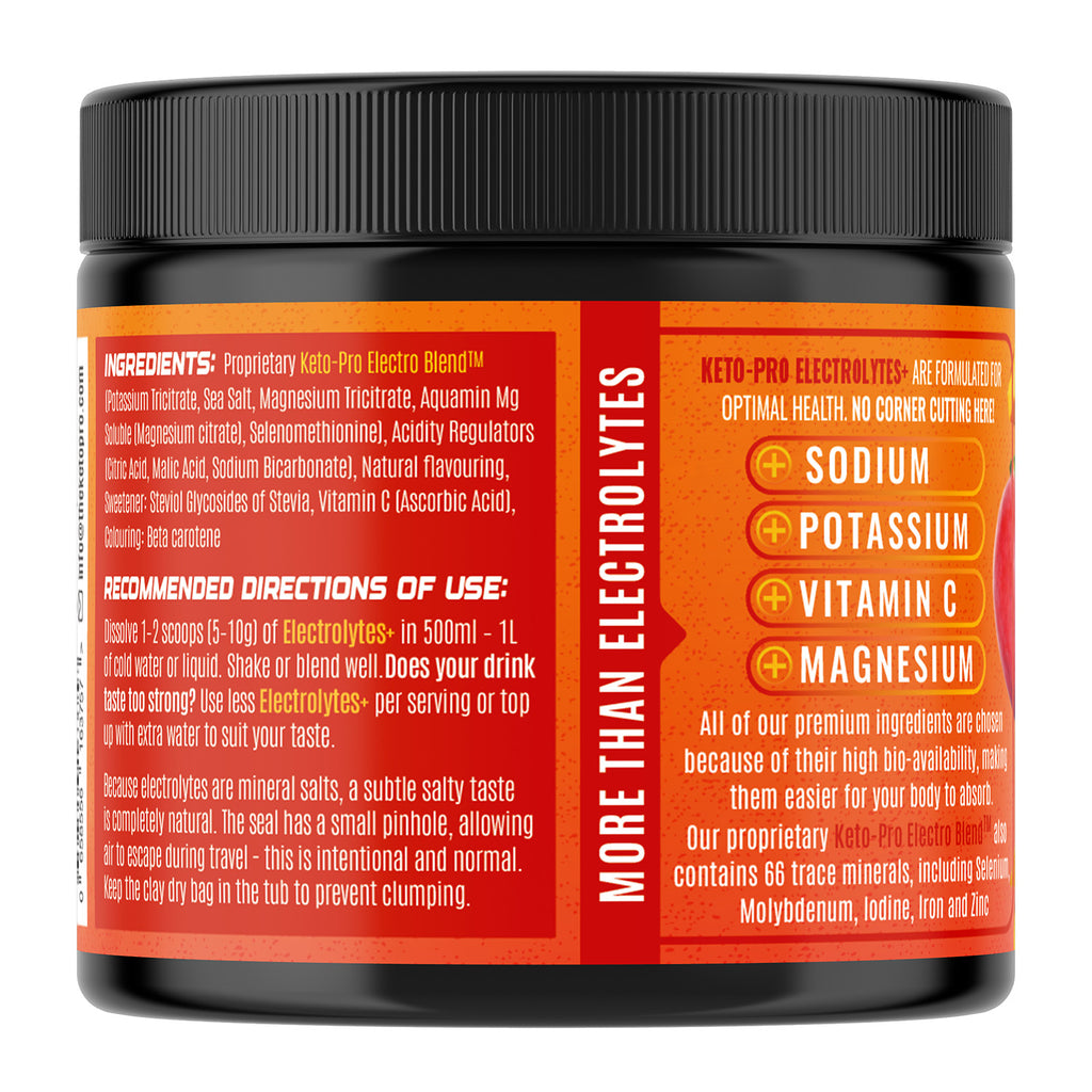 Proprietary Keto-Pro Electro Blend™ (Potassium Tricitrate, Sea Salt, Magnesium Tricitrate, Aquamin Mg Soluble (Magnesium citrate), Selenomethionine), Acidity Regulators (Citric Acid, Malic Acid, Sodium Bicarbonate), Natural flavouring, Sweetener: Steviol Glycosides of Stevia, Vitamin C (Ascorbic Acid), Colouring: Beta carotene