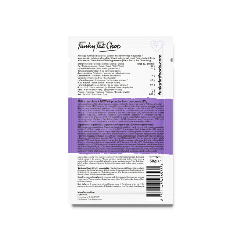 Description Think creamy, smooth milk chocolate – but without the dairy, and with a functional edge. This vegan bar blends 52% cacao with coconut milk, plant fibre and MCT oil for a silky melt and a smart energy lift that doesn’t rely on sugar. MCTs (medium-chain triglycerides) are clean-burning fats...