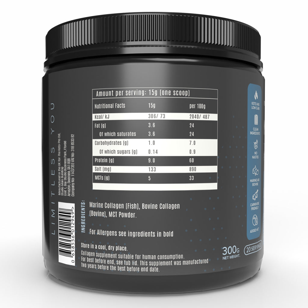 Description : Collagen is a prominent structural protein found in all animals. It makes up about a third of the proteins found in the human body but is largely absent from the average diet Our Keto Collagen contains MCT’s (Medium Chain Triglycerides) which quickly convert into Beta-Hydroxybutyrate… The SUPERIOR Ketone Body. MCT & BHB...